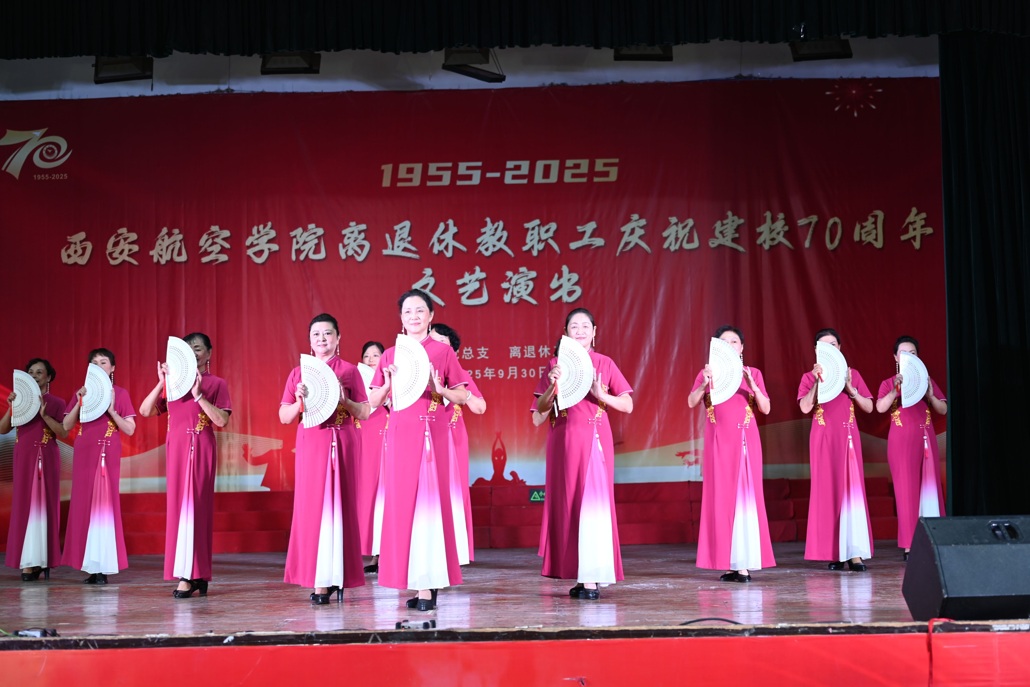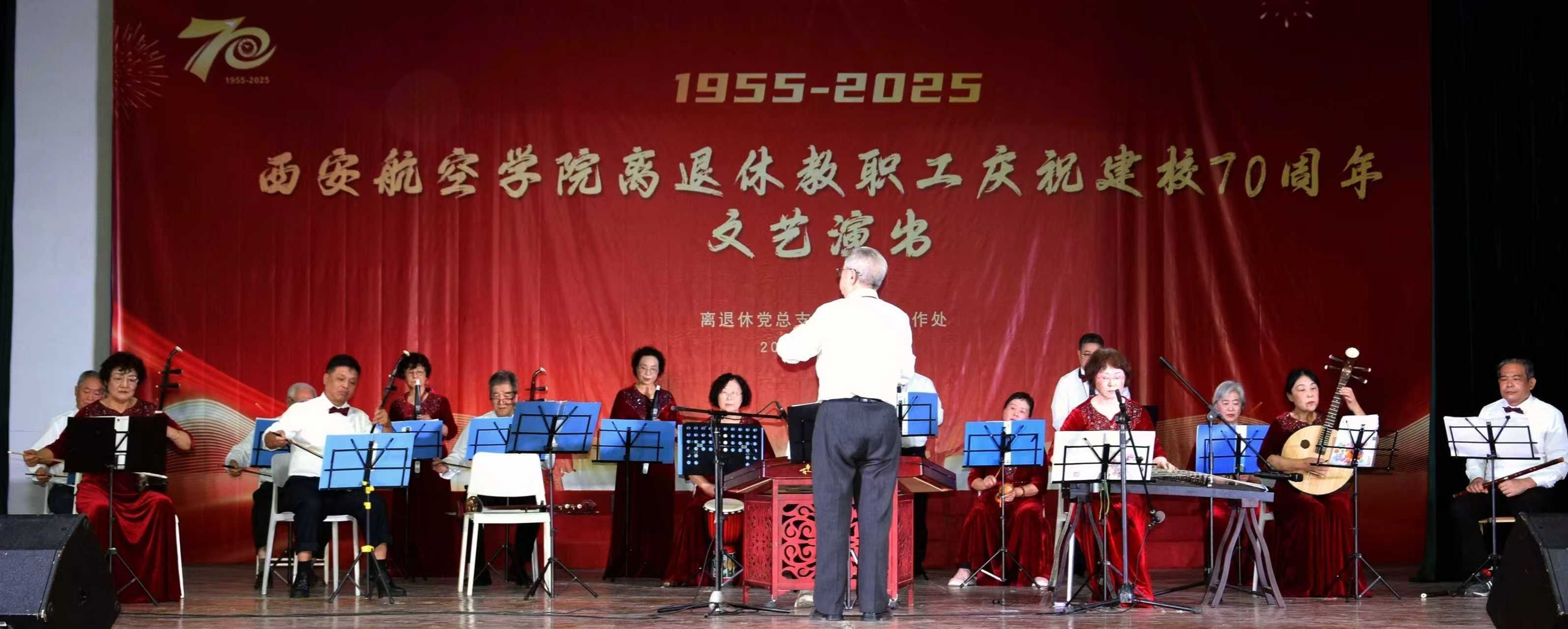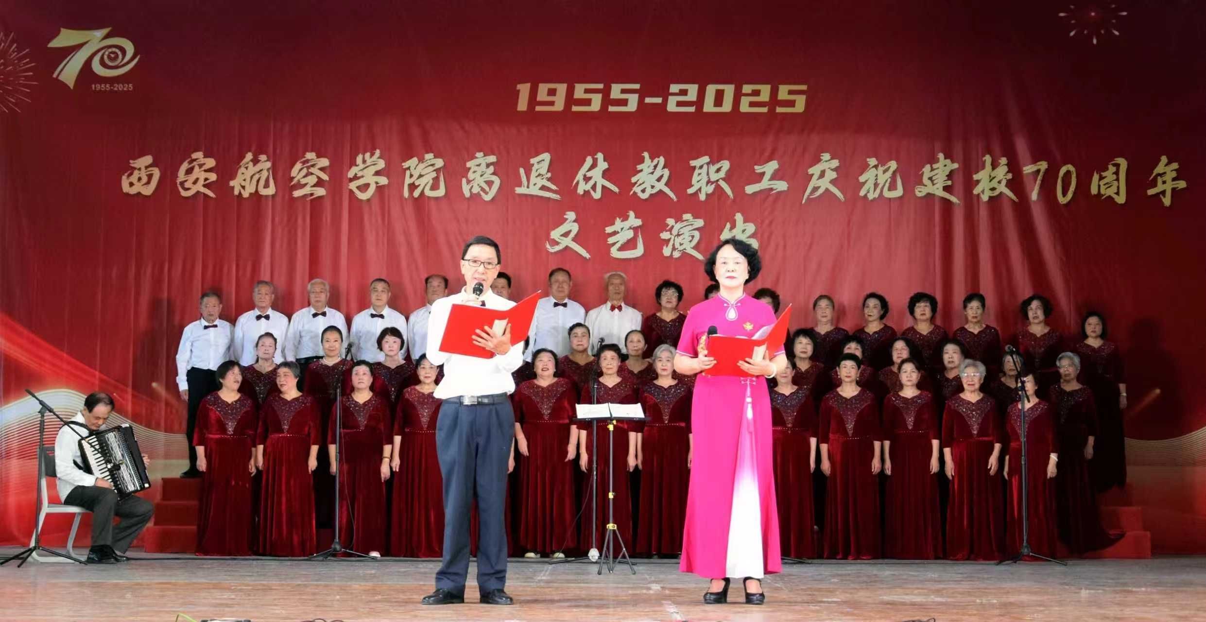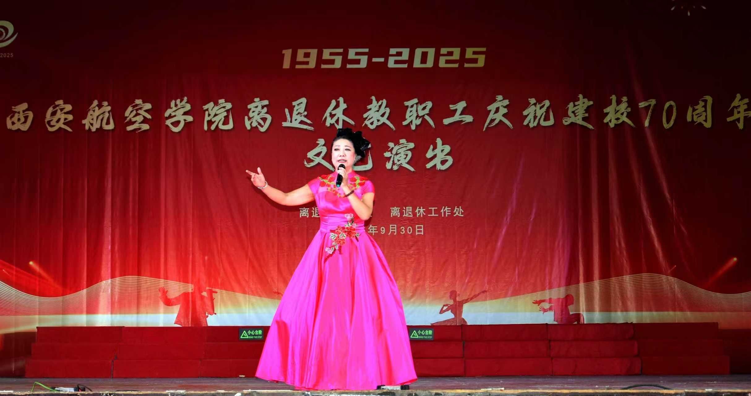 七秩华诞,桑榆献礼。9月30日,学校莲湖校区大学生活动中心华灯璀璨、喜气盈盈。学校党委副书记宁永录,桃园街道延光社区党工委书记贺君,学校党政办公室、党委组织部、人事处等部门负责人,以及师生代表和离退休教职工、家属等200余人齐聚一堂,以文艺汇演形式隆重庆祝国庆佳节和建校70周年。老同志们以歌抒怀,以舞寄情,共同见证学校七十年光辉历程,深情礼赞航空报国不朽篇章。