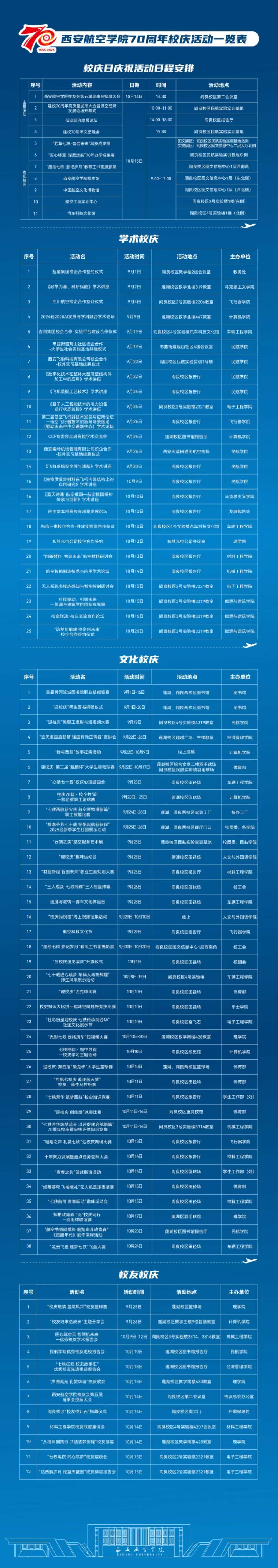 2025年10月15日,西安航空学院将迎来建校70周年。为回顾发展历史,展现建设成就,汇聚校友智慧与资源,增强发展合力,加快建设航空特色鲜明的高水平应用型大学,学校将于9月至10月,围绕“学术校庆、文化校庆、校友校庆”三大主题,集中开展一系列校庆活动。欢迎全校师生、全球校友、各界朋友同襄盛举,共庆华诞。